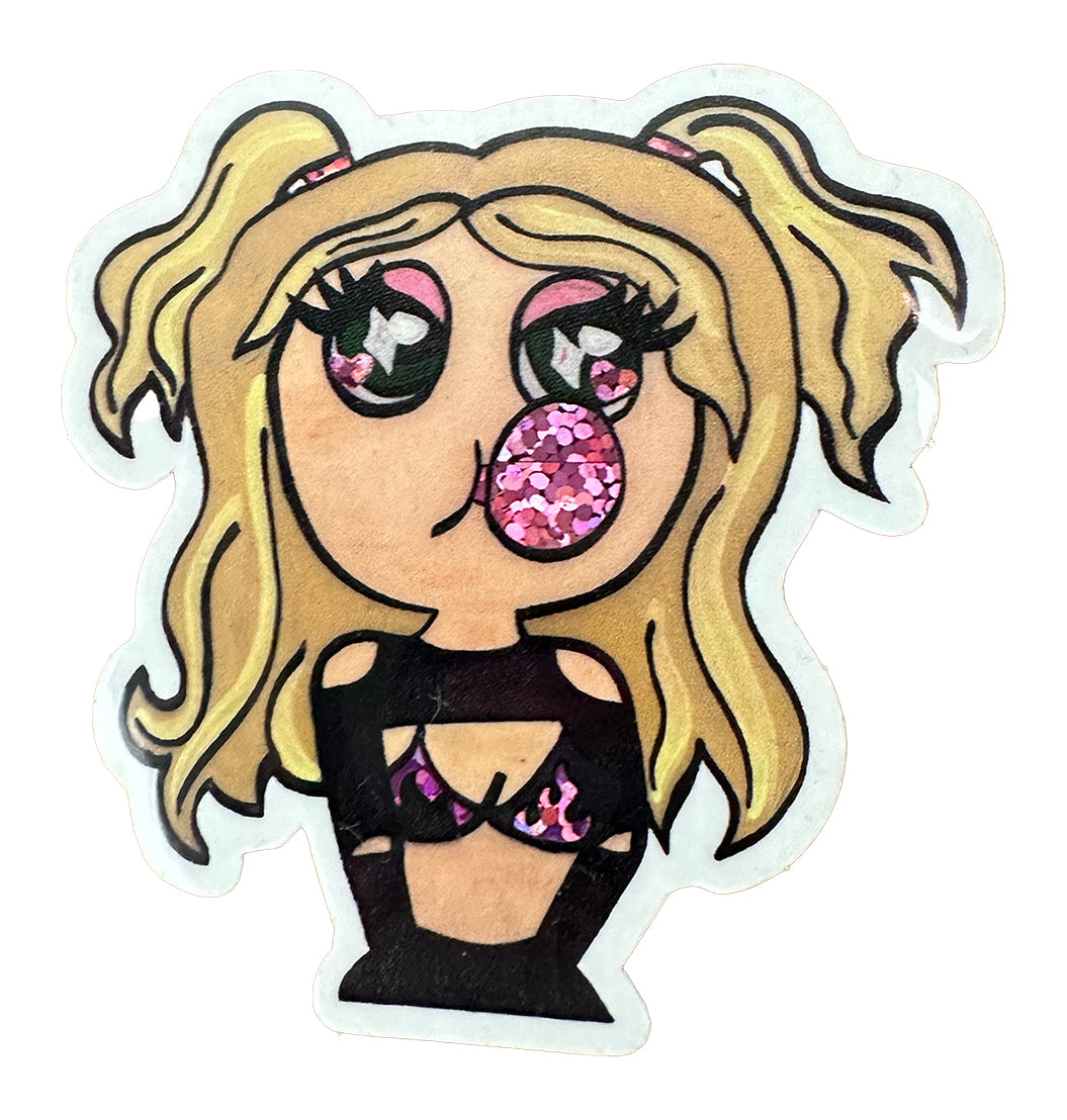 The Glitter Bubbles sticker comes in a 2" H x 2" W construction with a graphic of a girl wearing pigtails, blowing bubblegum with pretty pink glitter details. For easy application, this cute sticker has easy stick-and-peel adhesive on the back.